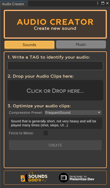To open it, go to Tools ▸ Melenitas Dev ▸ Sounds Good ▸ Audio Creator.